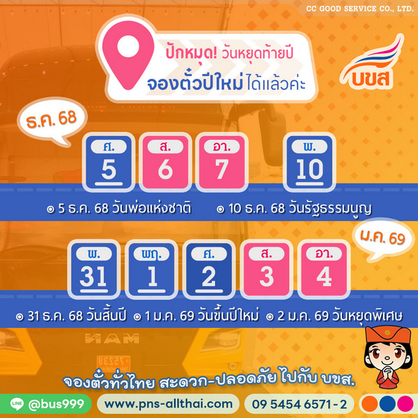www.pns-allthai.com 09 5454 6571-2 Line @bus999 บริษัท ซีซี กู๊ด เซอร์วิส จำกัด ตัวแทนจำหน่ายตั๋วรถโดยสาร บขส. 999 บริษัท ขนส่ง จำกัด บริการจองตั๋วรถทัวร์ บขส. ตรวจสอบเที่ยวรถ จองตั๋วล่วงหน้า ไม่ต้องต่อคิว เลือกที่นั่งได้เอง หลากหลายช่องทางรับชำระเงิน พิมพ์ตั๋ว E-ticket ขึ้นรถได้ทันที